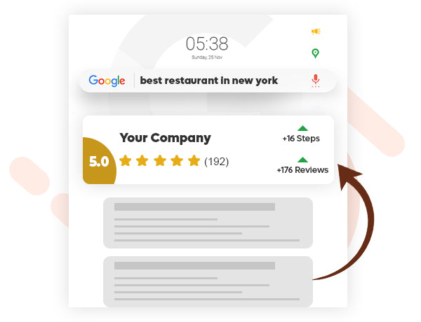 Daha fazla 5 yıldızlı yorum SEO'yu güçlendirerek işletmenizin Google arama sonuçlarında öne çıkmasını sağlar, çevrimiçi görünürlüğü artırır, daha fazla web sitesi trafiği çeker ve mağazaya daha fazla ziyaretçi çeker.